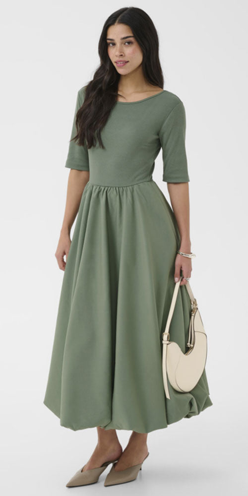 The bubble dress returns with a flattering half-sleeve design and ribbed jersey bodice that hugs in all the right places. A scooped back adds feminine, chic appeal, while elevated fabric in the skirt elevates the silhouette—perfect for opera nights or effortless everyday wear. Versatile enough to dress up or down, this piece is a wardrobe essential.
