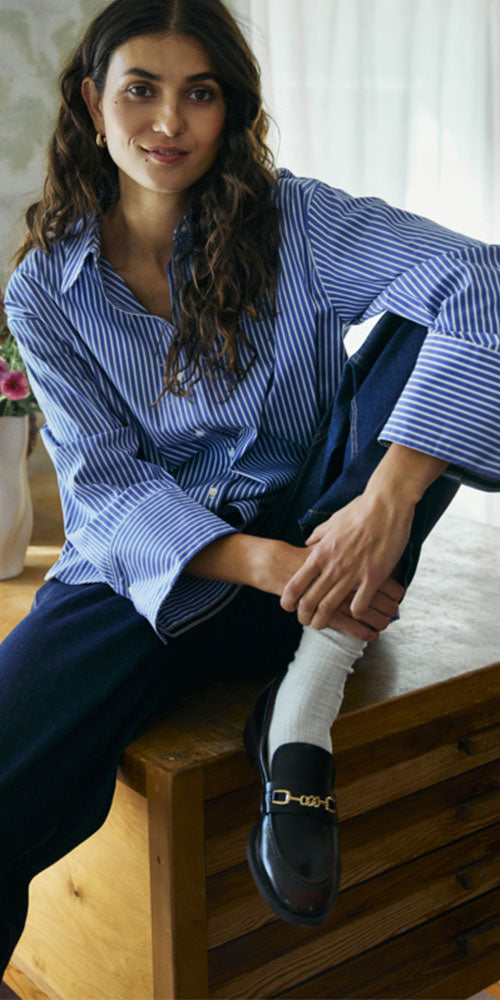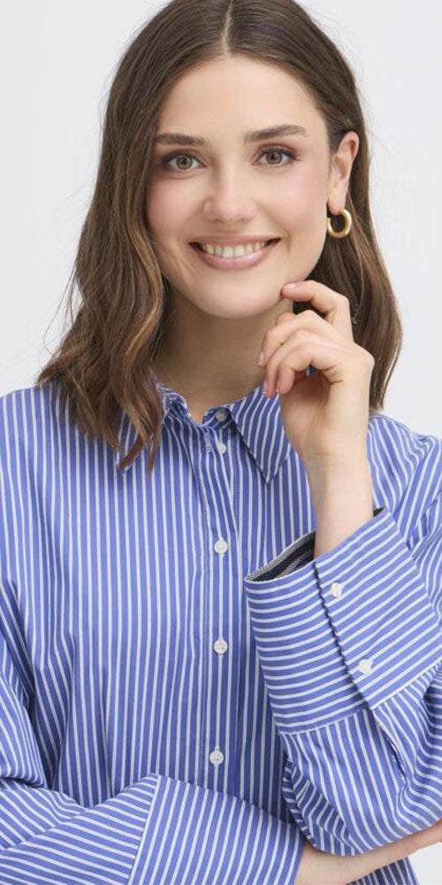 Size GuideElevate your wardrobe with the Fransa Striped Button Up Shirt. Crafted in a crisp bold blue with refined white stripes, this shirt features elegant button cuff details and a relaxed, loose fit for effortless comfort. Its sophisticated design balances timeless style with modern ease, perfect for a polished, on-trend look.