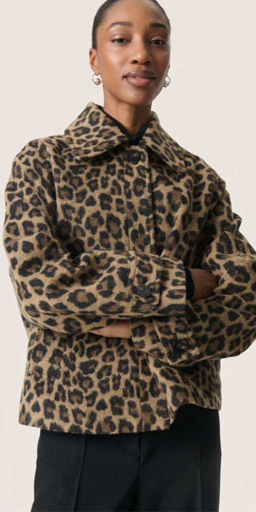 Size GuideThe Soaked Brushed Leopard Jacket features a striking leopard print paired with a luxuriously soft brushed texture. Its refined trench details add structure and elegance, making it a sophisticated statement...
