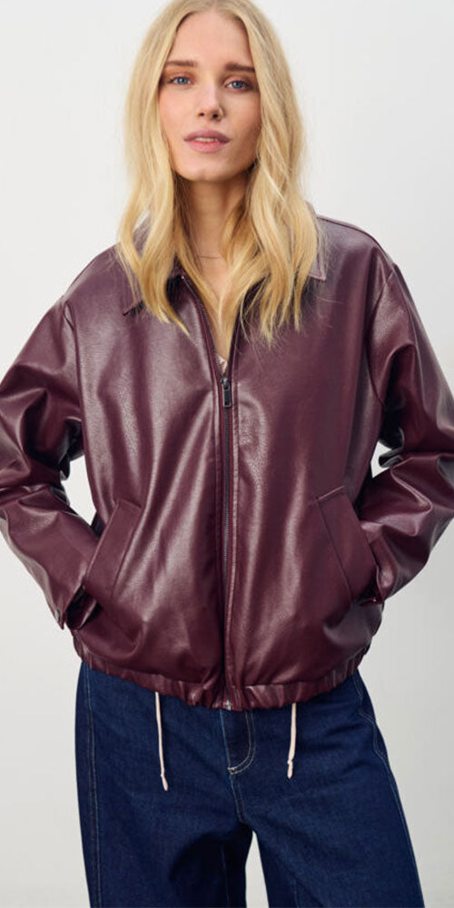 Size GuideAdd a splash of seasonal charm with the Saint Tropez Burgundy Faux Leather Bomber. This rich burgundy topper effortlessly amps up your look, adding a playful edge with its sleek...