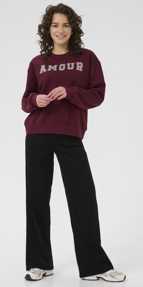 Size GuideEmbrace cozy vibes with the Kaffe Amour Sweatshirt, featuring bold collegiate lettering on a rich burgundy fleece—the perfect colour for the season. This playful piece effortlessly blends style and comfort, making warmth look effortlessly cool.