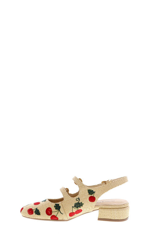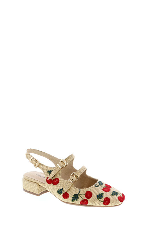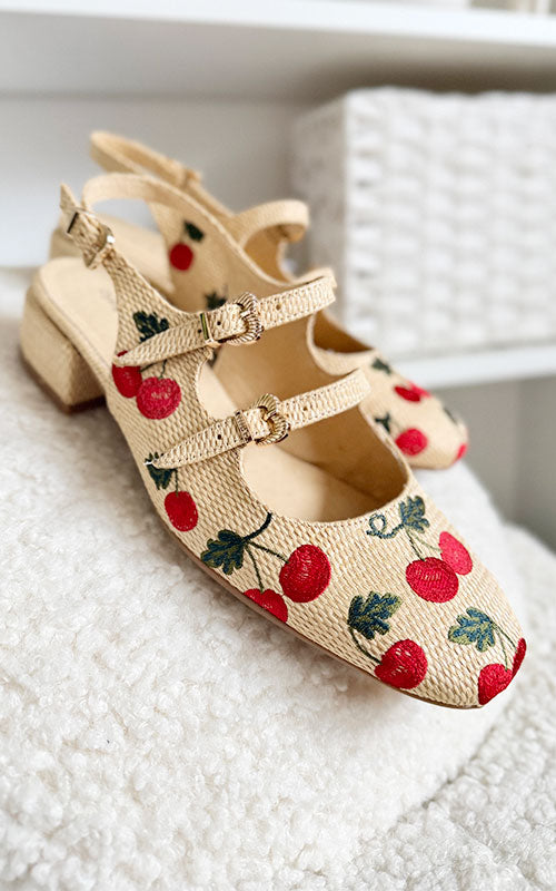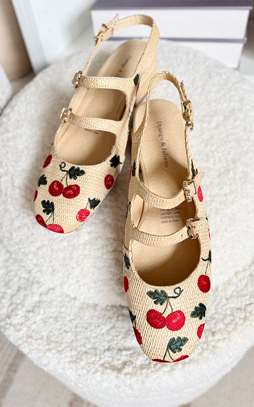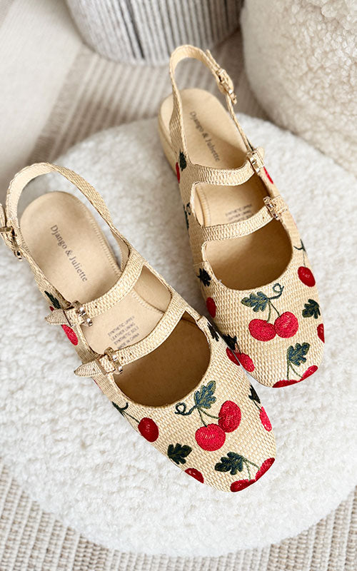Step into sweetness with the Django & Juliette Virazy—a charming mary-jane slingback that's equal parts whimsy and wearability. Crafted with textured raffia and adorned with delicate embroidered cherries, this shoe features three adjustable heart-shaped buckles that let you customize the perfect fit. A playful take on a timeless silhouette, it's the kind of shoe that makes every step feel a little more joyful.