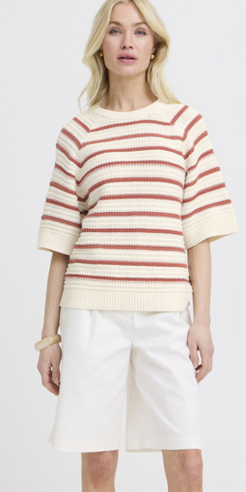 Size GuideEffortless layering meets summer ease with this cotton knit sweater tee. Crafted from 100% cotton in a soft cream base, it features a striking rusty-red marsala stripe running through the...