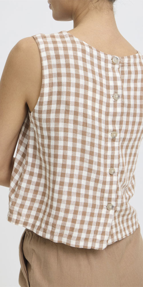 Size GuideEffortless layering meets timeless style with this classic sleeveless shell top. Crafted in a linen blend for breathable comfort, it features natural buttons running up the back and hits just below the waist for a flattering, versatile silhouette. The perfect coordinating piece to pair with our linen blend pants in the same gingham pattern for a fun, put-together look.