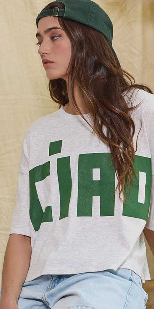 Size GuideMeet your new favourite tee. The Ciao Tee combines a substantial heavy jersey knit with a relaxed boxy silhouette that feels as comfortable as it looks. Eye-catching bold lettering gives...