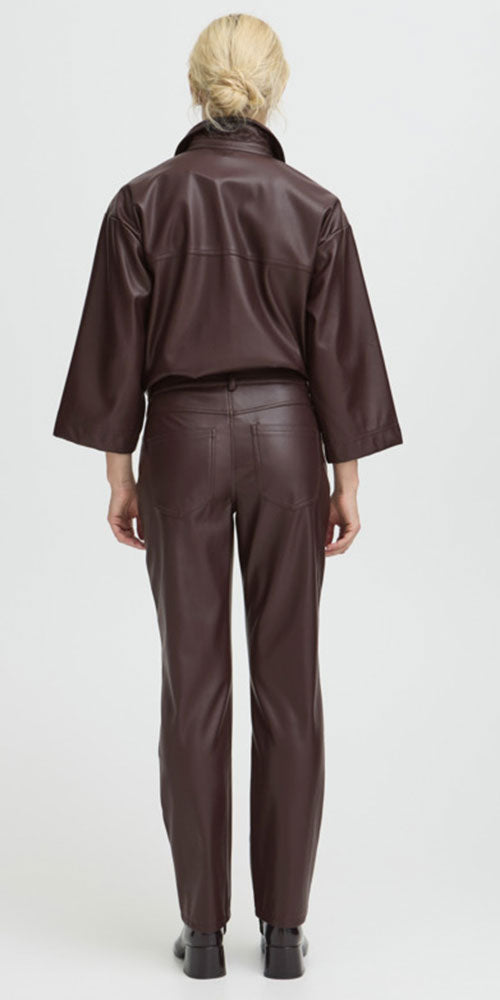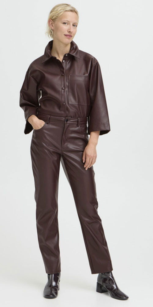 Size GuideElevate your wardrobe with a pop of sophisticated colour! These eggplant toned straight leg pants blend faux leather sophistication with classic jean-inspired details for an effortlessly chic vibe. The sleek silhouette transitions seamlessly from day to night—layer with cozy textural knits for warmth or pair with delicate sheer ruffles for an unexpected twist.