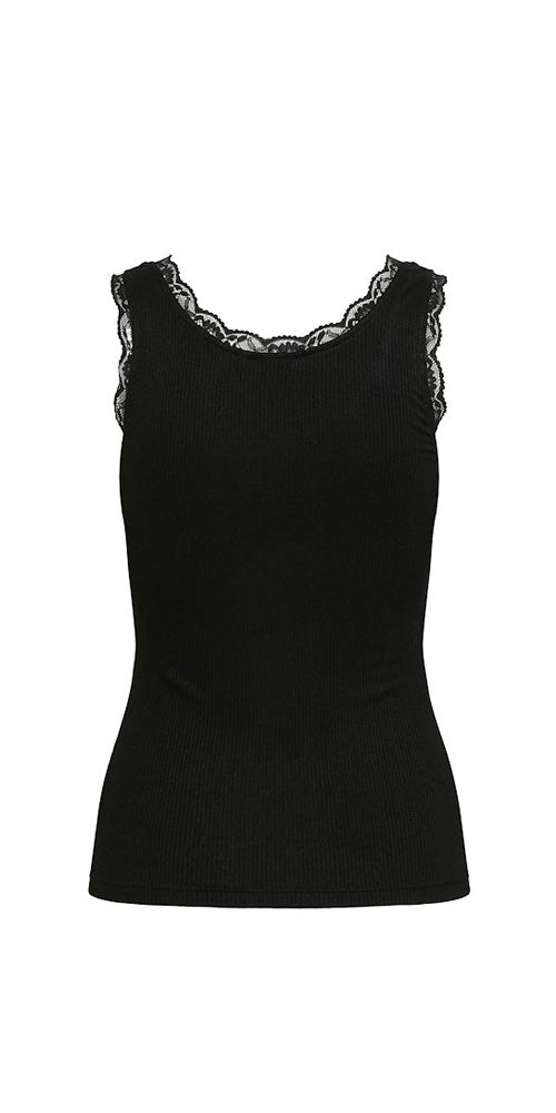 Size GuideThis black cami crafted from fine viscose rib knit fits like a dream and features delicate lace edges for a flirty touch. Perfect for layering under blazers or cardigans, it...