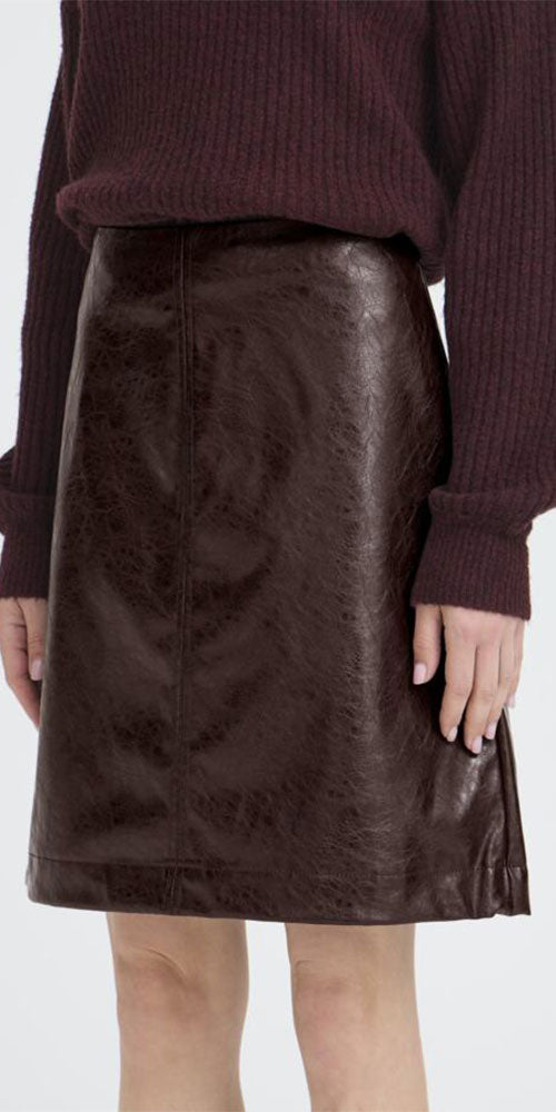 Size GuideElevate your fall style with this playful A-line skirt crafted from glossy faux leather in a deep burgundy shade. Its flattering silhouette adds a touch of fun and flair, perfect...