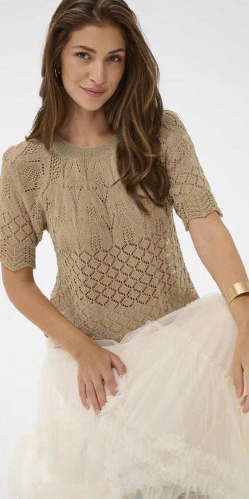 Delicate scallop knit crafted in warm taupe with refined raglan sleeves for effortless movement. Layer this sophisticated piece with the matching skirt to create a striking two-piece ensemble ideal for warm-weather travel and elevated everyday wear. The textured knit and thoughtful construction make it a versatile wardrobe essential that transitions seamlessly from day to evening.
