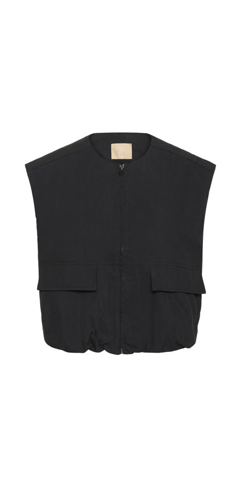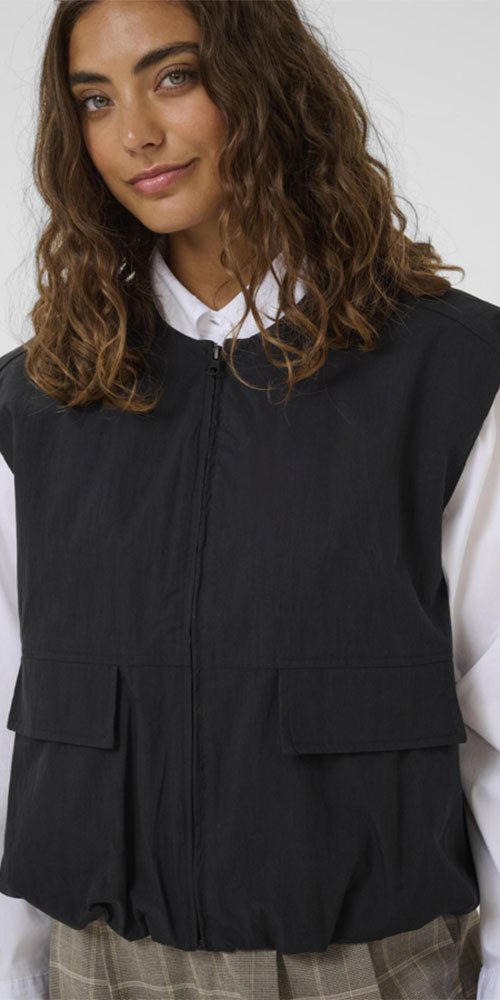 Size GuideCrisp poplin construction meets relaxed tailoring in this effortless zip-front vest. Layer it over basics for instant polish, or pair with the matching skirt for a coordinated look that feels anything but matchy-matchy. Black goes with everything—wear it now, wear it forever.
