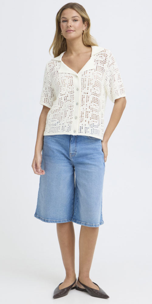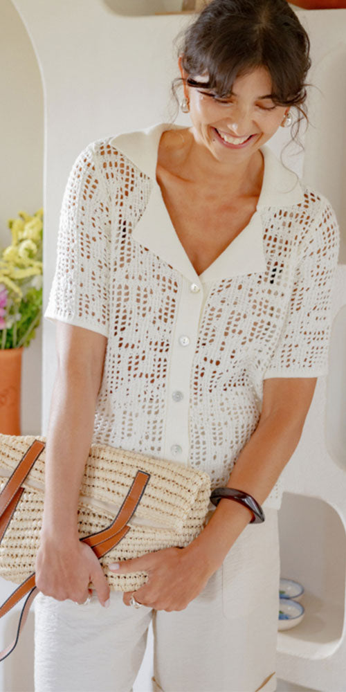 Size GuideEffortlessly chic and breathable, this open knit polo cardy bridges the gap between a classic polo and a cozy cardigan. The gorgeous patterned knit brings summery sophistication to any warm-weather wardrobe. Layer it over whites for a crisp, fresh look or pair with your favourite denims for casual elegance. The airy construction keeps you cool while the refined design works beautifully for both relaxed days and elevated casual occasions.
