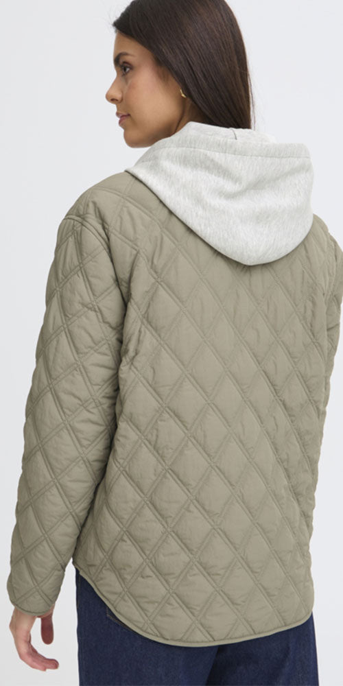 Size GuideLayer up without the bulk! This quilted transitional jacket features a built-in faux hoodie layer that adds dimension and warmth without extra weight. The snap and zip front combo gives you flexible closure options, while the heathered grey and khaki colourways work with everything in your closet. Perfect for those in-between seasons when you want cozy style that actually moves with you.
