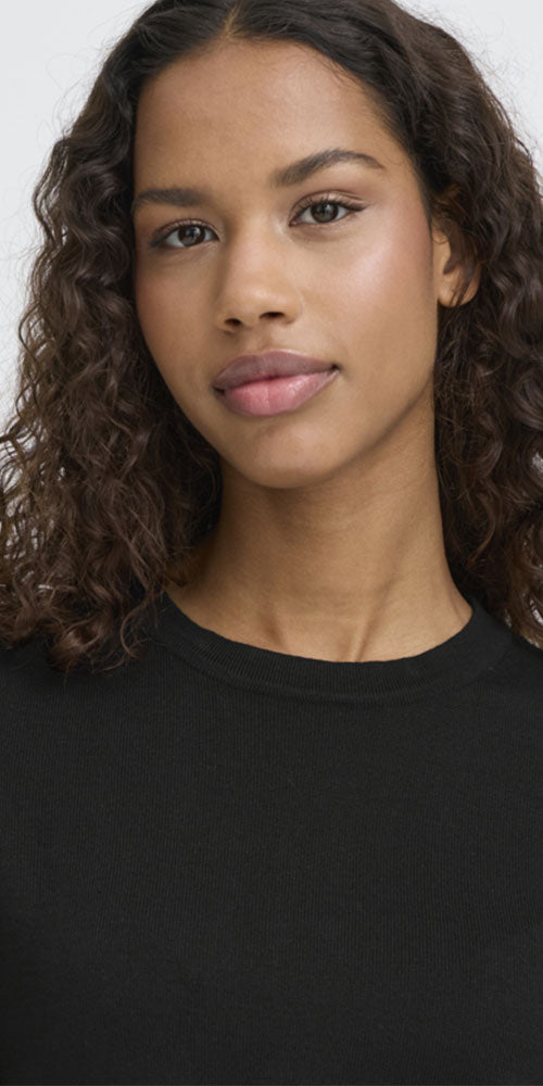 Size GuideEffortless layering just got an upgrade. This fine knit sweater tee blends the comfort of a classic tee with the polish of a lightweight sweater—think relaxed vibes without the bulk. Cut to hip length with a generous, easy-wearing fit, it's the kind of piece that works solo or layered under your favorite jacket. Smooth knit fabric keeps things soft against your skin, while the neutral black hue pairs with literally everything in your closet. Your new go-to basic just arrived.