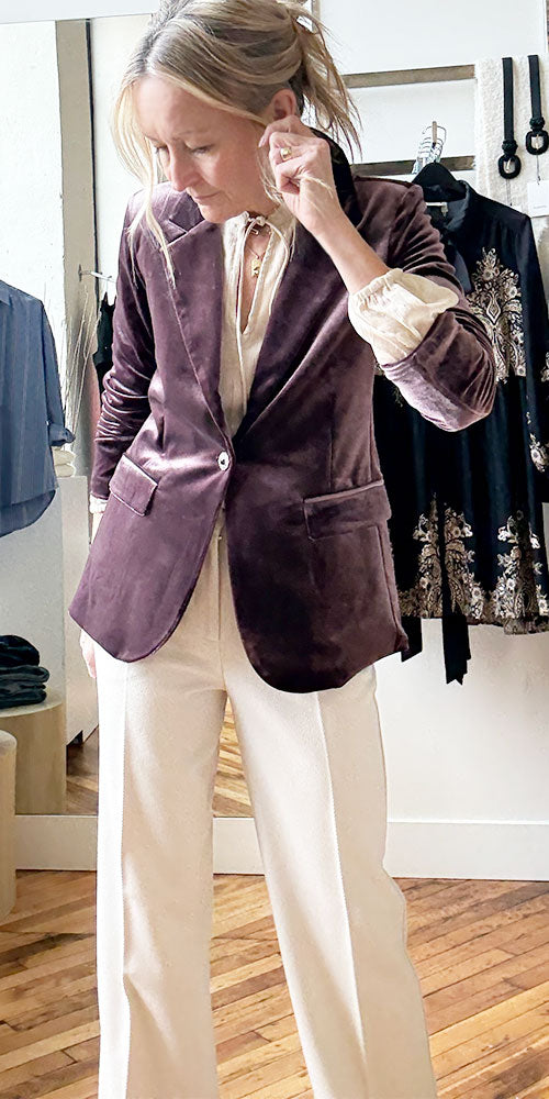 Get ready to sparkle and shine with this gorgeous shimmery velvet blazer in a rich dusty eggplant hue. Its timeless blazer cut makes it the ultimate layering piece—throw it over...