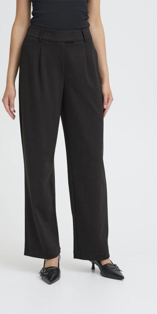 Size GuideElevate your everyday ponte knit with a touch of festive glamour. These Ichi trousers feature subtle black rhinestone embellishments that catch the light beautifully, paired with soft pleats at the waist and a polished trouser front. The luxuriously soft knit fabric moves with you, making these the perfect piece for dressing up casual looks or adding sparkle to your holiday rotation. Versatile, comfortable, and undeniably chic.