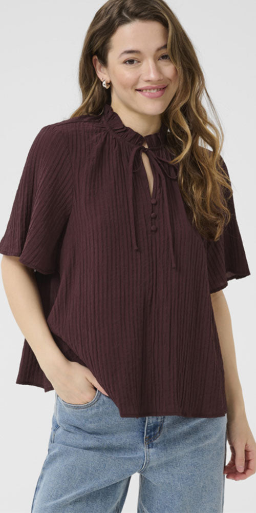 Size GuideThis sweet Kaffe Flutter Blouse in dark fudge bursts with a rich pop of dark burgundy-brown. Featuring delicate covered buttons and a playful ruffle at the neck, it brings pretty feminine details to life. Perfectly suited for dressing up or down, it adds a charming twist to any outfit.