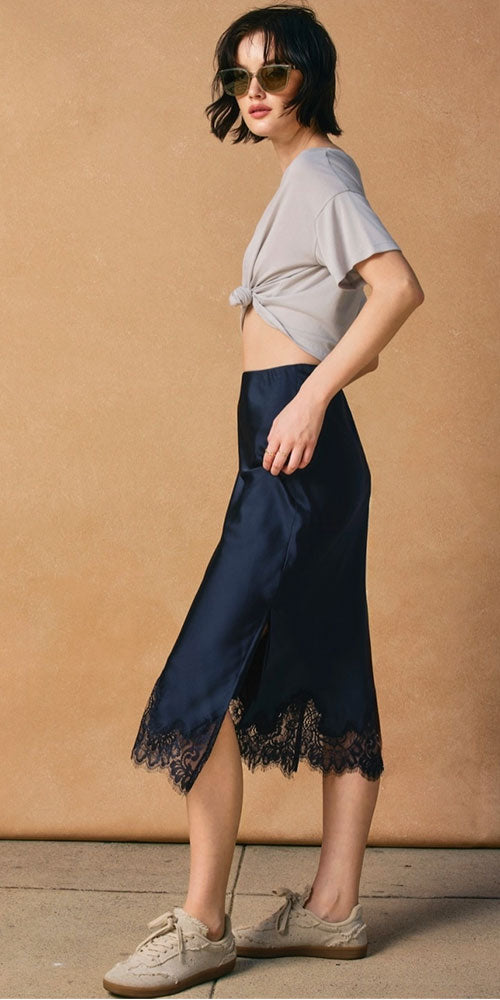 Size GuideMeet your new go-to midi: a navy satin skirt that's equal parts polished and playful. The graceful bias cut creates a flattering drape that moves with you, while the built-in lining keeps things comfortable and secure. Matching lace trim along the hem adds just enough edge to feel current without trying too hard. Versatile enough for cocktails, brunch, or a night out—layer up for the perfect on-trend look.