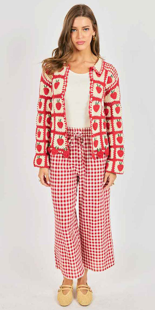 Size GuideEmbrace springtime charm with this delightful crochet cardigan, handcrafted with adorable strawberry details that bring a playful pop of red to your wardrobe. Perfect for layering on cool mornings or tossing over summer dresses, this piece captures that effortless, whimsical vibe that makes getting dressed fun. The intricate crochet texture adds texture and visual interest, while the strawberry motifs celebrate the season's sweetest spirit.