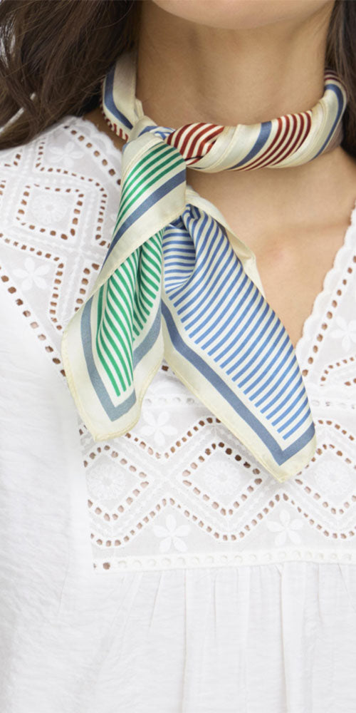 Size GuideSilk neck scarf in tones of fuschia, navy, bordeaux and cream 100% silk 20" square