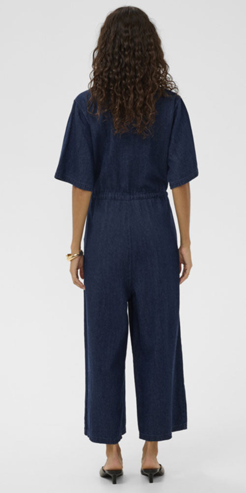 Size GuideEffortless comfort meets timeless style with this one-and-done jumpsuit. Crafted from a soft cotton and linen blend denim, it drapes beautifully while maintaining its shape. The adjustable drawstring waist ensures a custom fit, making it perfect for all-day wear—whether you're running errands or relaxing at home. Slip it on and go. Dark navy completes any wardrobe.