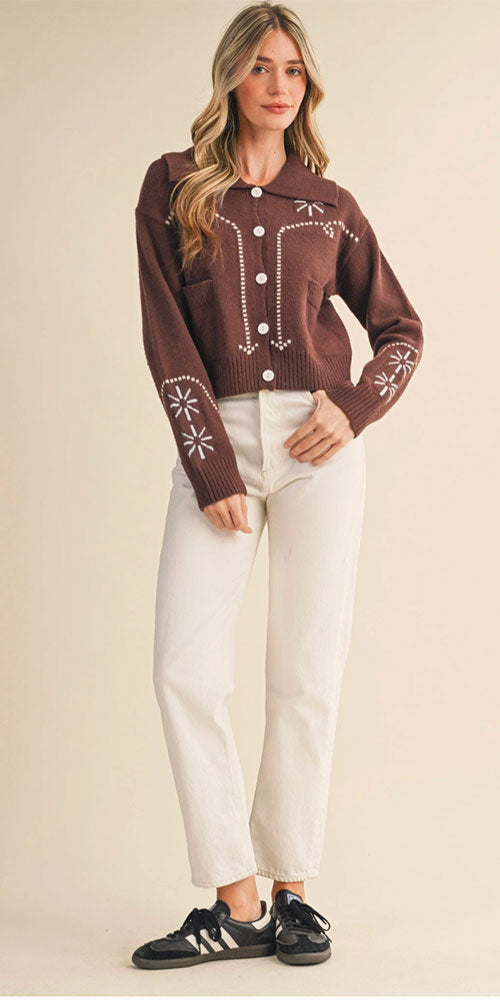 Size GuideThis brown cardigan brings Western charm with its striking contrast stitching—delicate flowers and flowing lines in cream and icy blue create a look that's equal parts cowgirl and cool. Throw it over your favorite high-waisted jeans or pair it with neutral basics for effortless style that works from the ranch to the city. A versatile piece that adds character to any outfit.